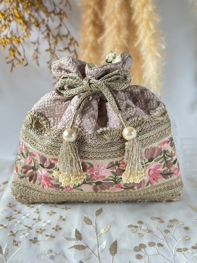 AliletサイズHarmonia ✾長財布が入るAlilet限定サイズ✾ ギリシャ語由来で、「調和」や「調和のとれた美しさ」を意味する名前 優しい色合いと華やかな刺繍のデザインが調和し、フェミニンで上品な印象 ピンクとグリーン系の配色がかわいい インドらしさもある刺繍 全面刺繍なので生地もしっかりめ タッセルは控えめに ポトリの底にあしらわれたパールビーズの装飾は 職人が1つ1つ手作業で行っております 素敵な刺繍のデザインは 綺麗め〜カジュアルまで 様々な場面で活躍してくれます 【私らしさを纏う】 【私だけのお気に入り】 【世界に1つだけの1点モノ】 忙しい日々 心が疲れた時 なんでもない1日をちょっと特別な日に 頑張っている自分へのご褒美に♥ ※パールビーズの三つ編みハンドルは別売りです 【素材】 生地:刺繍入りジョーゼット生地(表)、ポリサテン(裏) 装飾:パールビーズ、クリアビーズ チェーン:金属(ゴールド) 【色】 生地: 刺繍:ピンク、グリーン タッセル:シルバー、ホワイト 引き紐・持ち手:ゴールド 【サイズ】 約縦26cm×横30.5cm(ポトリ下部) ※個体差あり 【お手入れ方法】 汚れてしまった場合は、ドライクリーニング推奨 ご自宅での保管は付属の保管袋をご利用ください