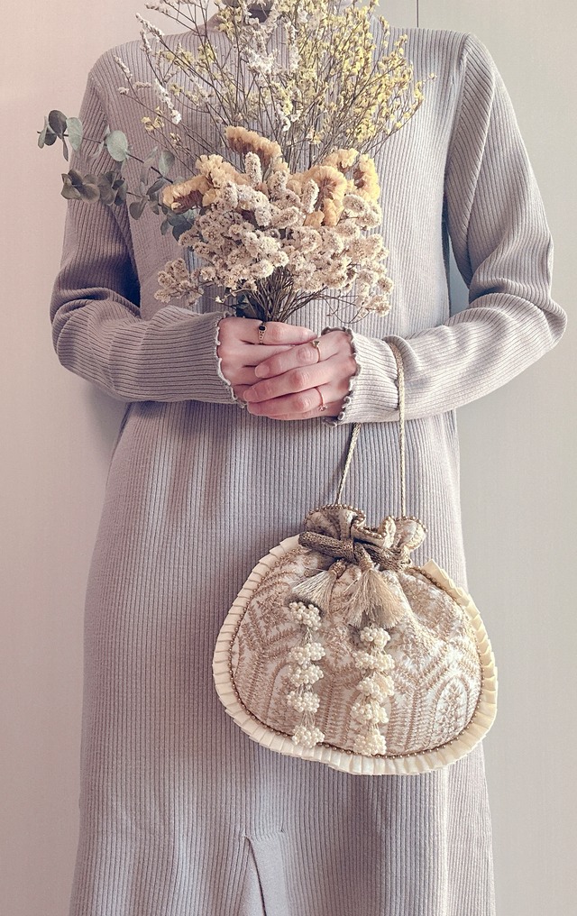 Mughal 名前はムガル刺繍からきています ムガル刺繍は、インドのムガル帝国時代に発展した伝統的な刺繍技法 この刺繍は、特に豪華で精緻なデザインが特徴で、花や植物、動物などのモチーフが多く用いられるそうです 一見シンプルなホワイトの生地 よく見ると細かな花柄と刺繍、スパンコールが縫い込まれており、とても繊細な作り 刺繍好きにはたまらない一品となっております また、持ち手は巾着部分から伸びる刺繍リボンがそのまま持ち手になっている特徴的なデザイン ここでしか出逢えない刺繍バッグに仕上がっております ホワイトメインのデザインは 綺麗め〜カジュアルまで 様々な場面で活躍してくれます なんでもない1日をちょっと特別な日に 忙しい日々 心が疲れた時 自分の選んだお気に入りを眺めたり 一緒に出掛けたり 頑張っている自分へのご褒美に♥ 【素材】 生地:刺繍入りジョーゼット生地(表)、ポリサテン(裏) 装飾:シルク糸、金糸 チェーン:金属(ゴールド) 【色】 生地:ホワイト 刺繍:ホワイト、ゴールド タッセル:シルバー 引き紐・持ち手:シャンパンゴールド 【サイズ】 約22cm×23cm ※個体差あり 【お手入れ方法】 汚れてしまった場合は、ドライクリーニング推奨 ご自宅での保管は付属の保管袋をご利用ください