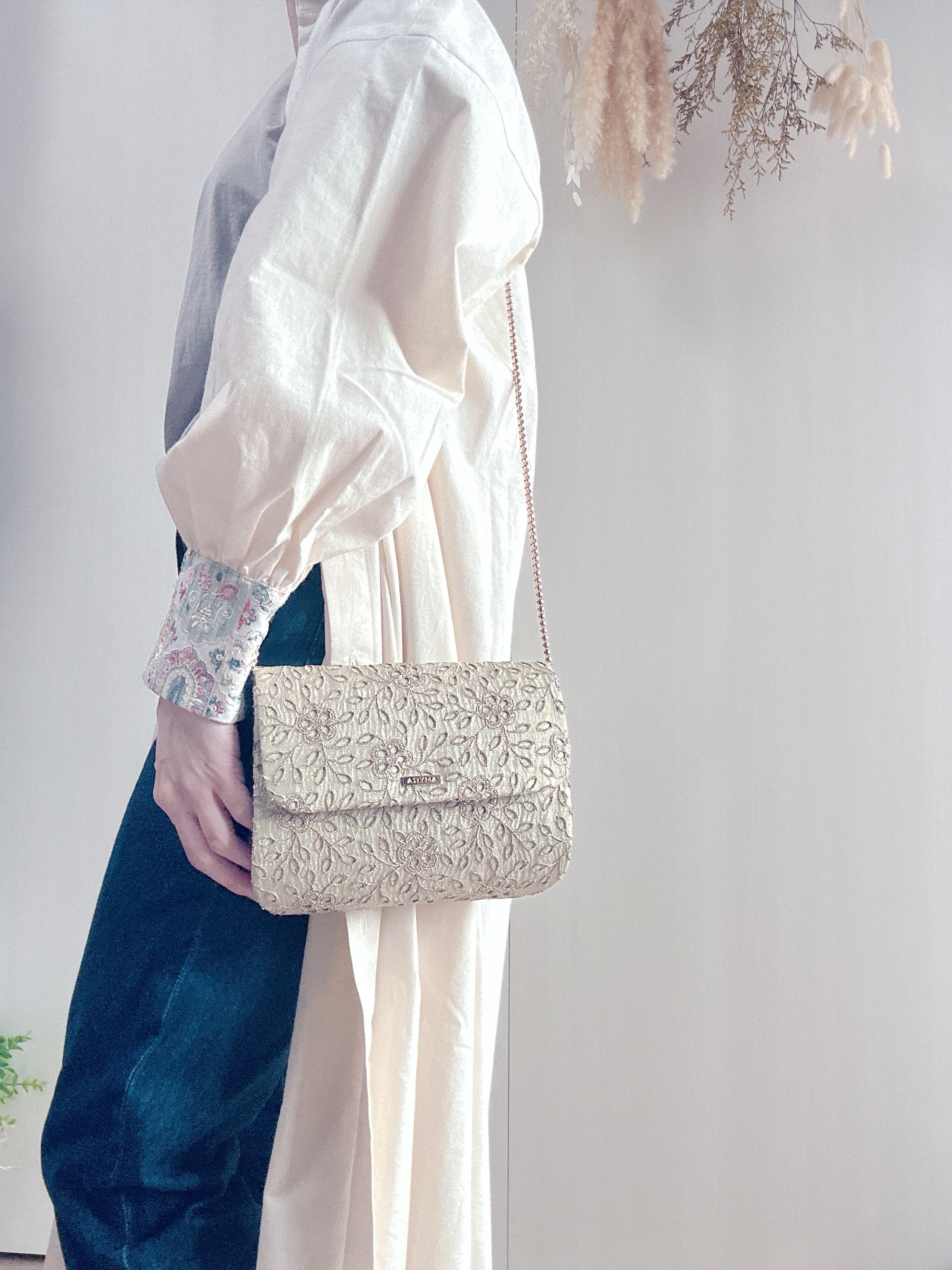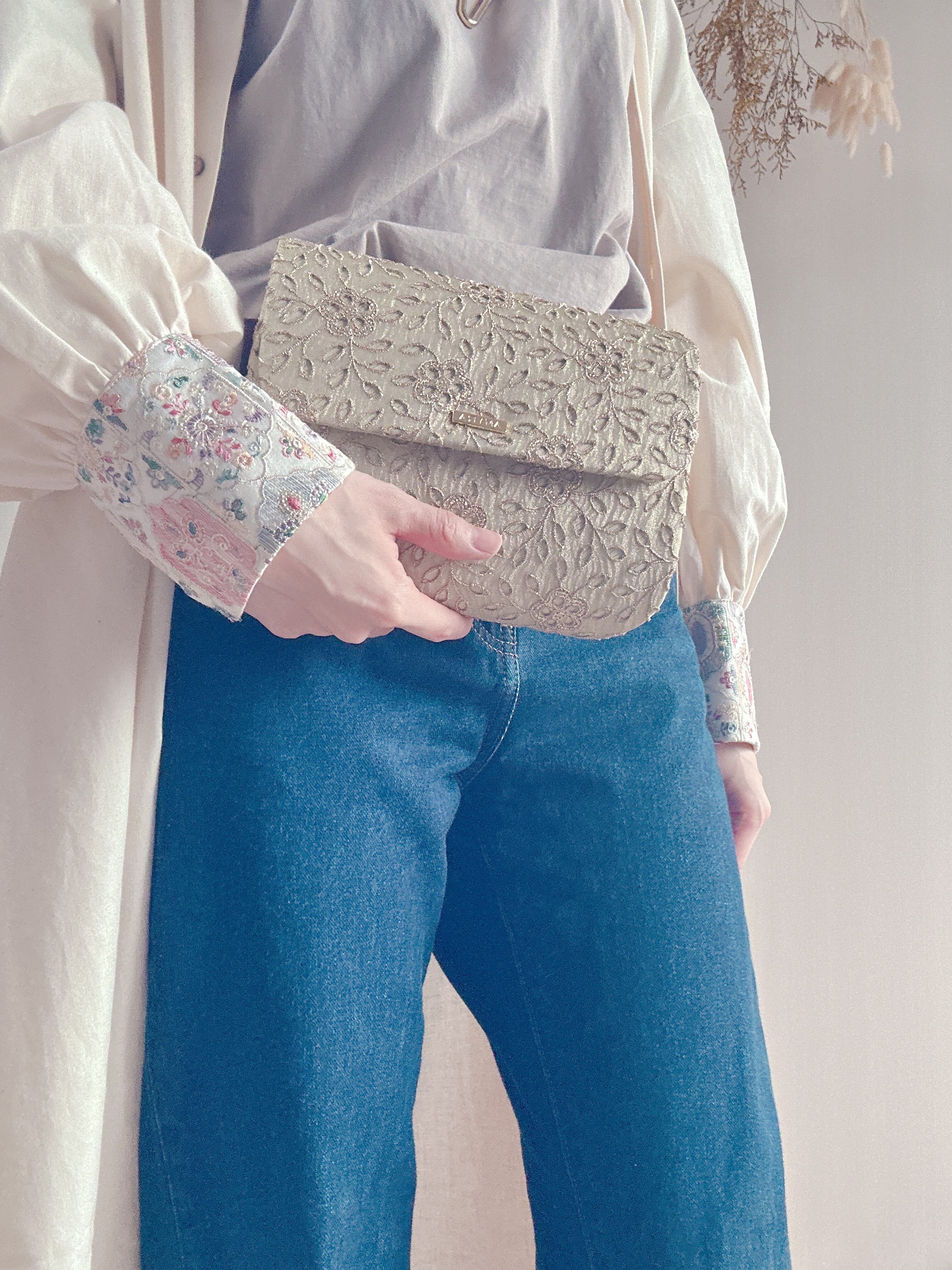 ゴールドの糸で花々を描いたクラッチバッグ
