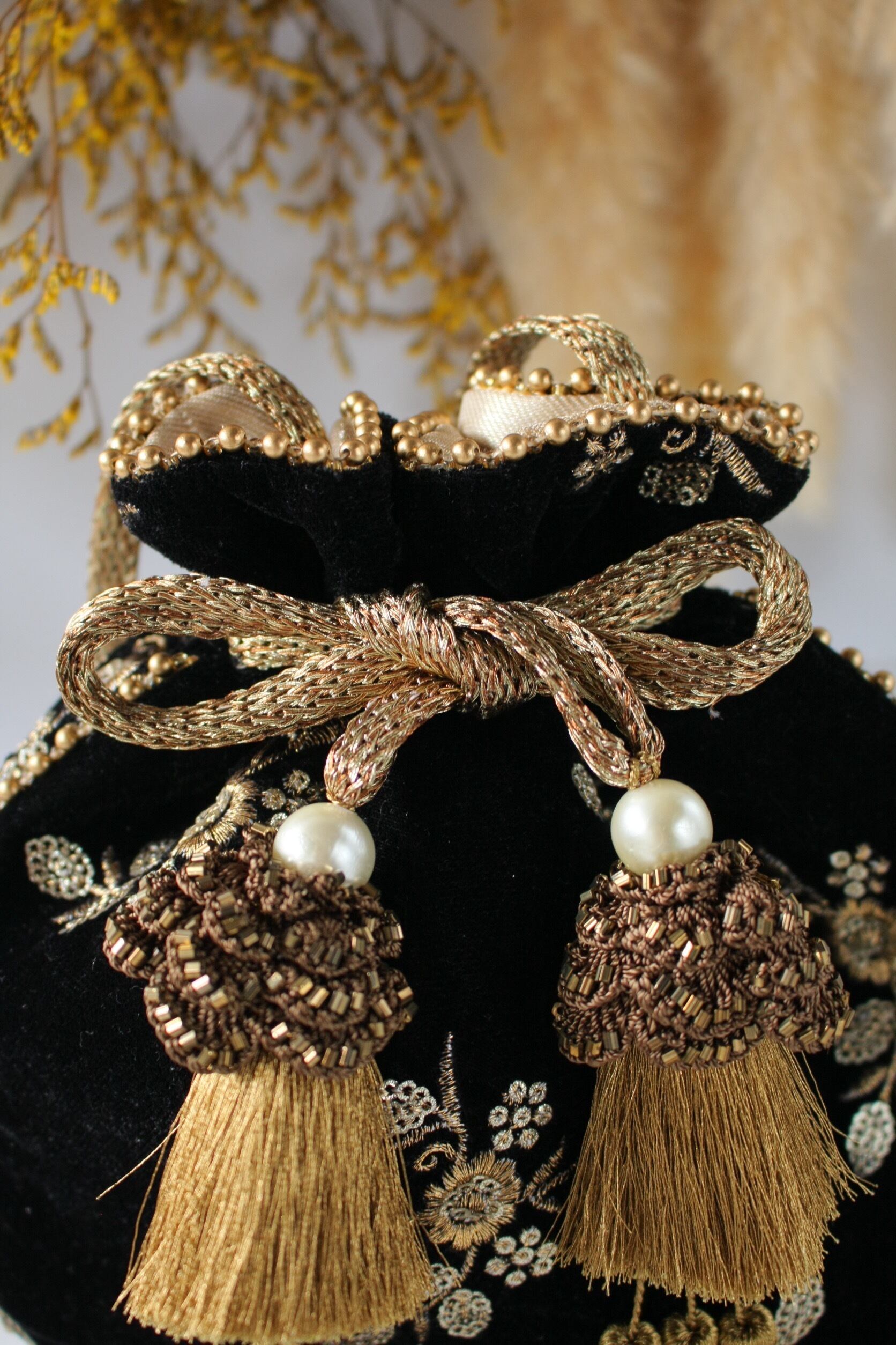 アンティークゴールドの刺繍や装飾で統一